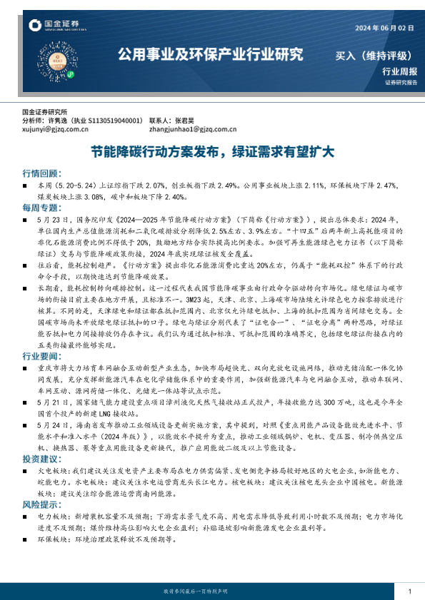 【国金证券】【20240603】2024-06-03-公用事业及环保产业行业研究-节能降碳行动方案发布-绿证需求有望扩大-16页
