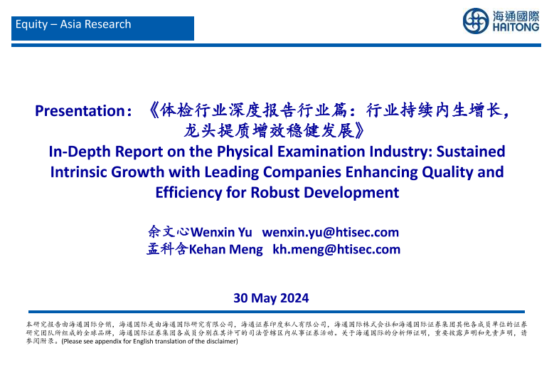 【海通国际】【20240604】体检行业深度报告行业篇:行业持续内生增长,龙头提质增效稳健发展-33页