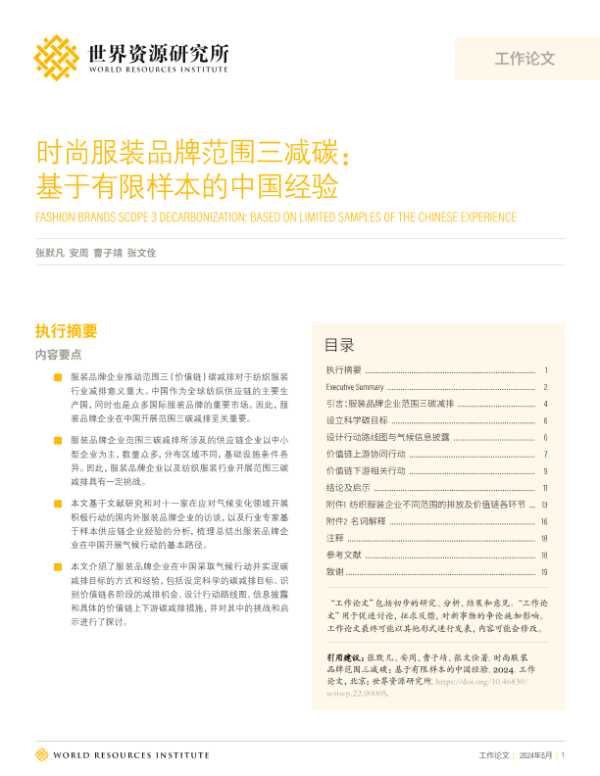 【世界资源研究所】【202405】2024时尚服装品牌范围三减碳:基于有限样本的中国经验研究报告-20页