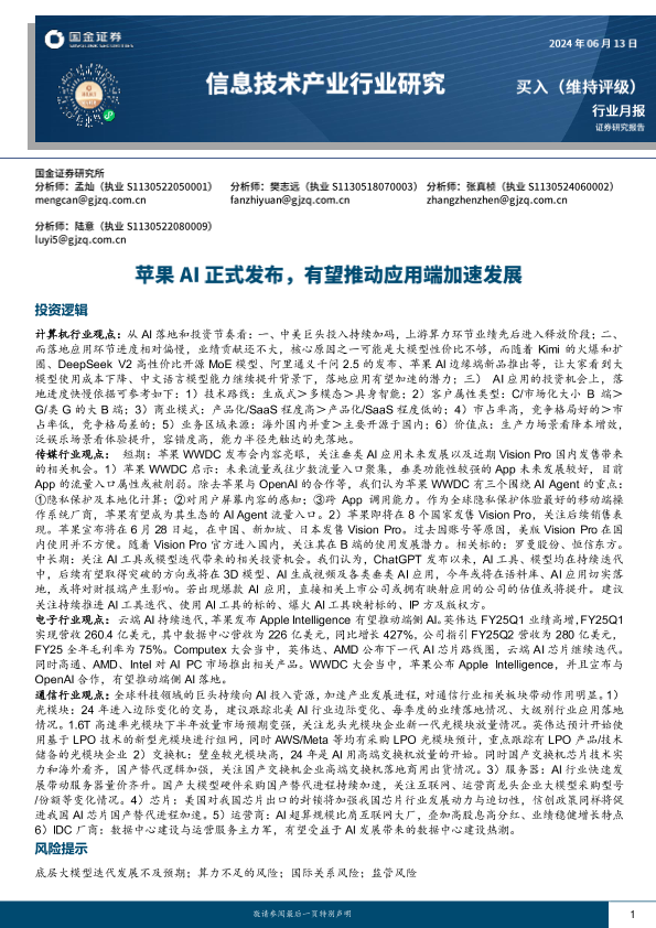 【国金证券】【20240614】2024-06-14-信息技术产业行业研究-苹果AI正式发布-有望推动应用端加速发展-18页