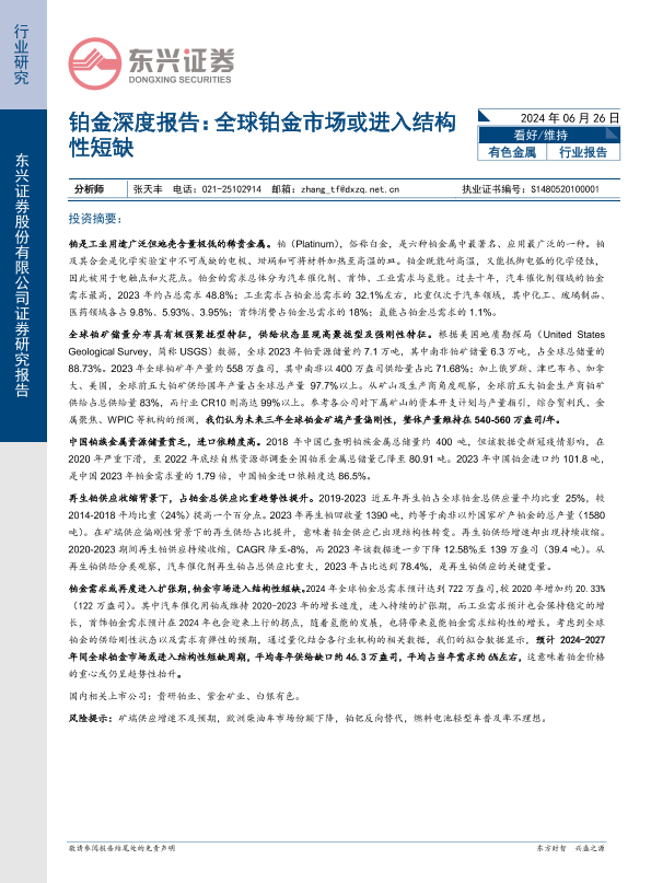 【东兴证券】【20240626】铂金深度报告:全球铂金市场或进入结构性短缺-26页