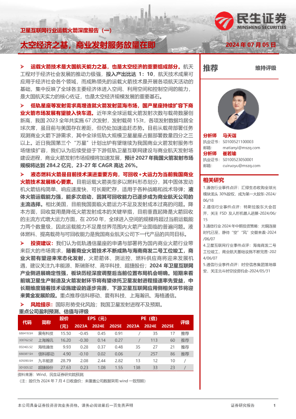 【民生证券】【20240706】卫星互联网行业运载火箭深度报告(一)-太空经济之基-商业发射服务放量在即-40页
