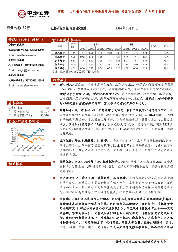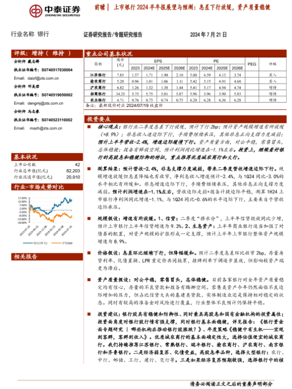 【中泰证券】【20240721】2024-07-22-前瞻│上市银行2024半年报展望与预测-息差下行放缓-资产质量稳健-25页