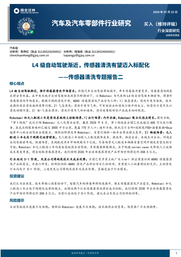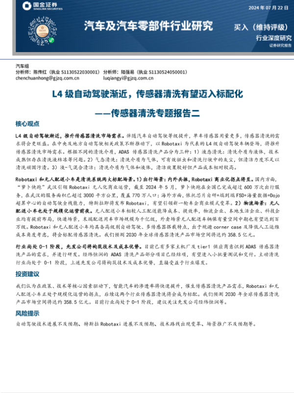 【国金证券】【20240723】2024-07-23-汽车及汽车零部件行业研究-传感器清洗专题报告二-L4级自动驾驶渐近-传感器清洗有望迈入标配化-22页