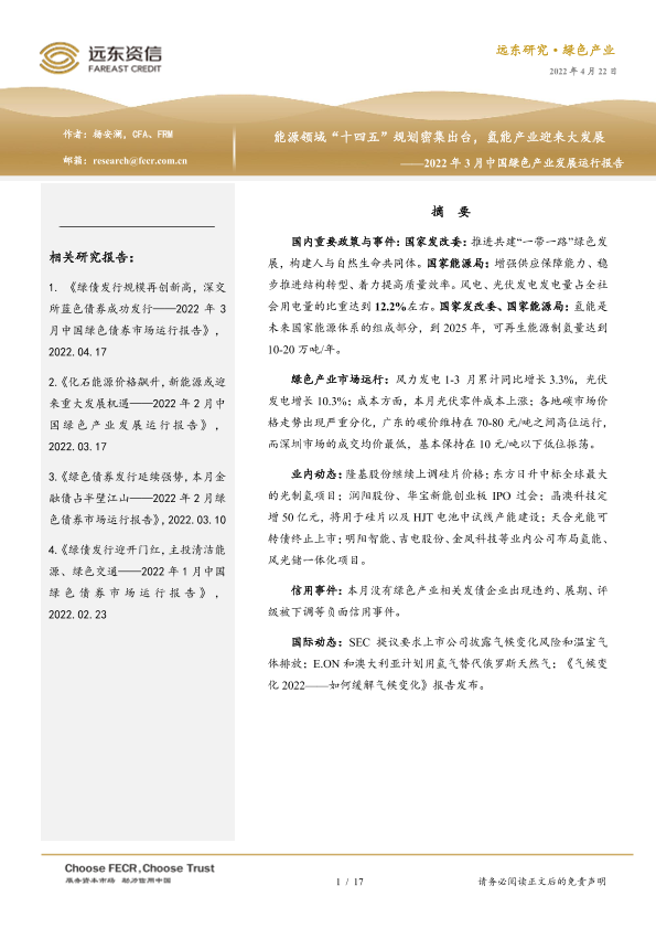 【远东资信】【20220422】2022年3月中国绿色产业发展运行报告:能源领域“十四五”规划密集出台,氢能产业迎来大发展-17页