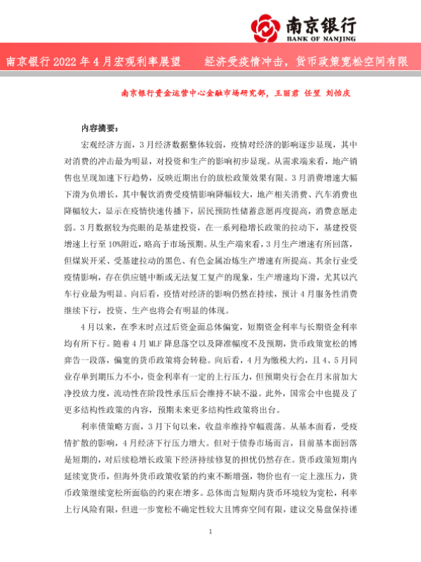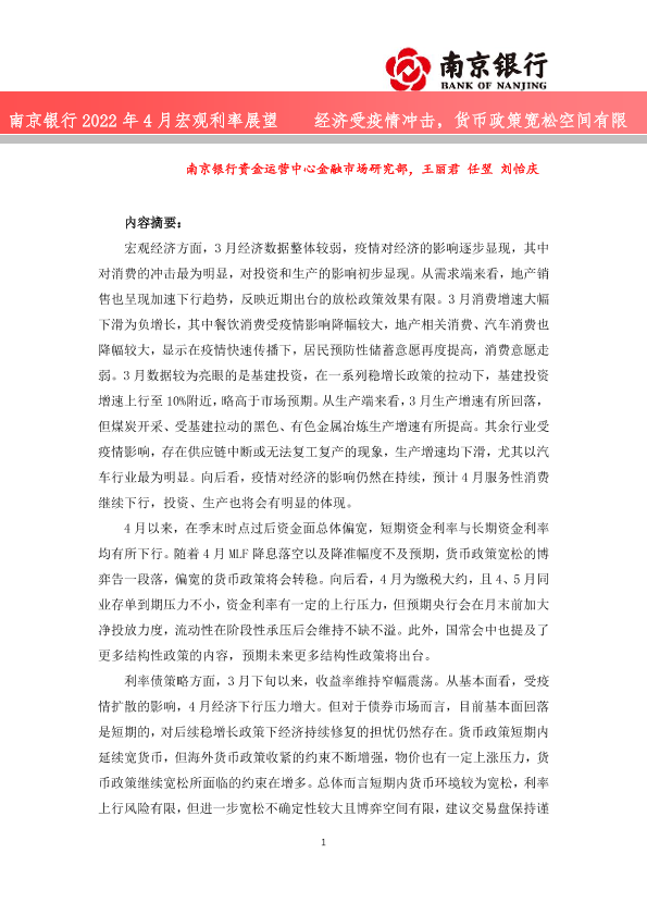 【南京银行】【20220426】2022年4月宏观利率展望:经济受疫情冲击,货币政策宽松空间有限-41页