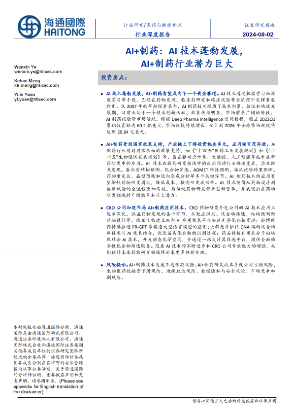 【海通国际】【20240803】2024-08-03-医药与健康护理行业深度报告-AI+制药-AI技术蓬勃发展-AI+制药行业潜力巨大-29页