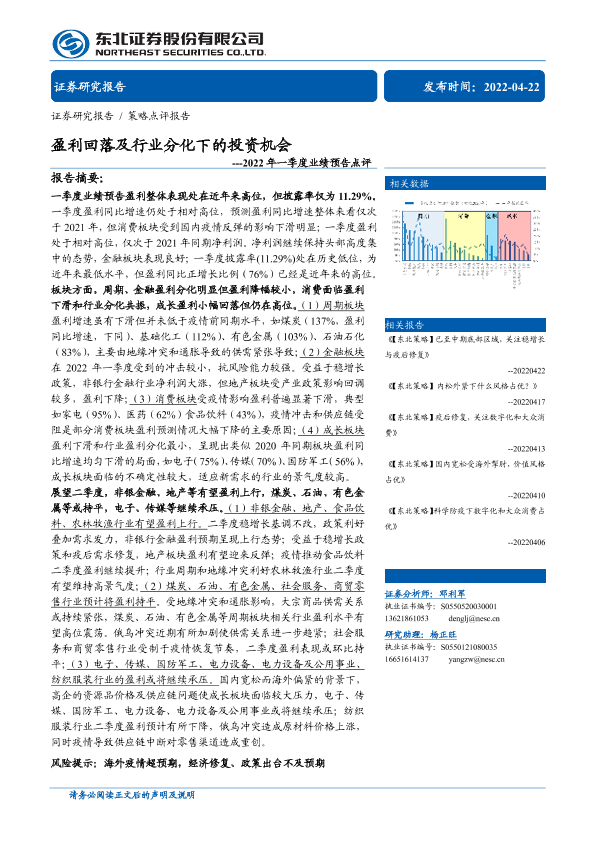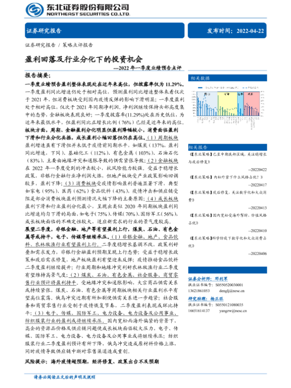 【东北证券】【20220422】2022年一季度业绩预告点评:盈利回落及行业分化下的投资机会-17页
