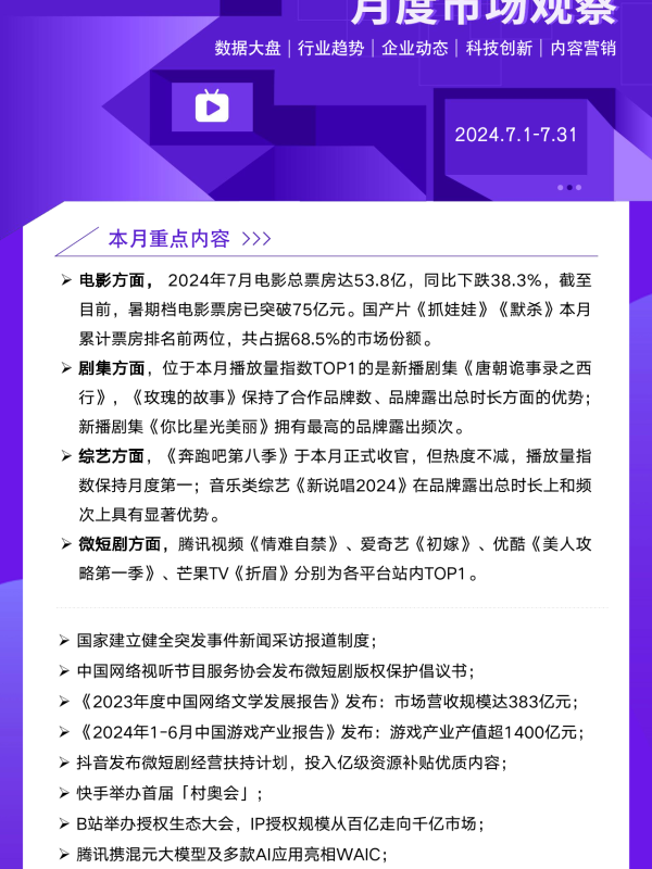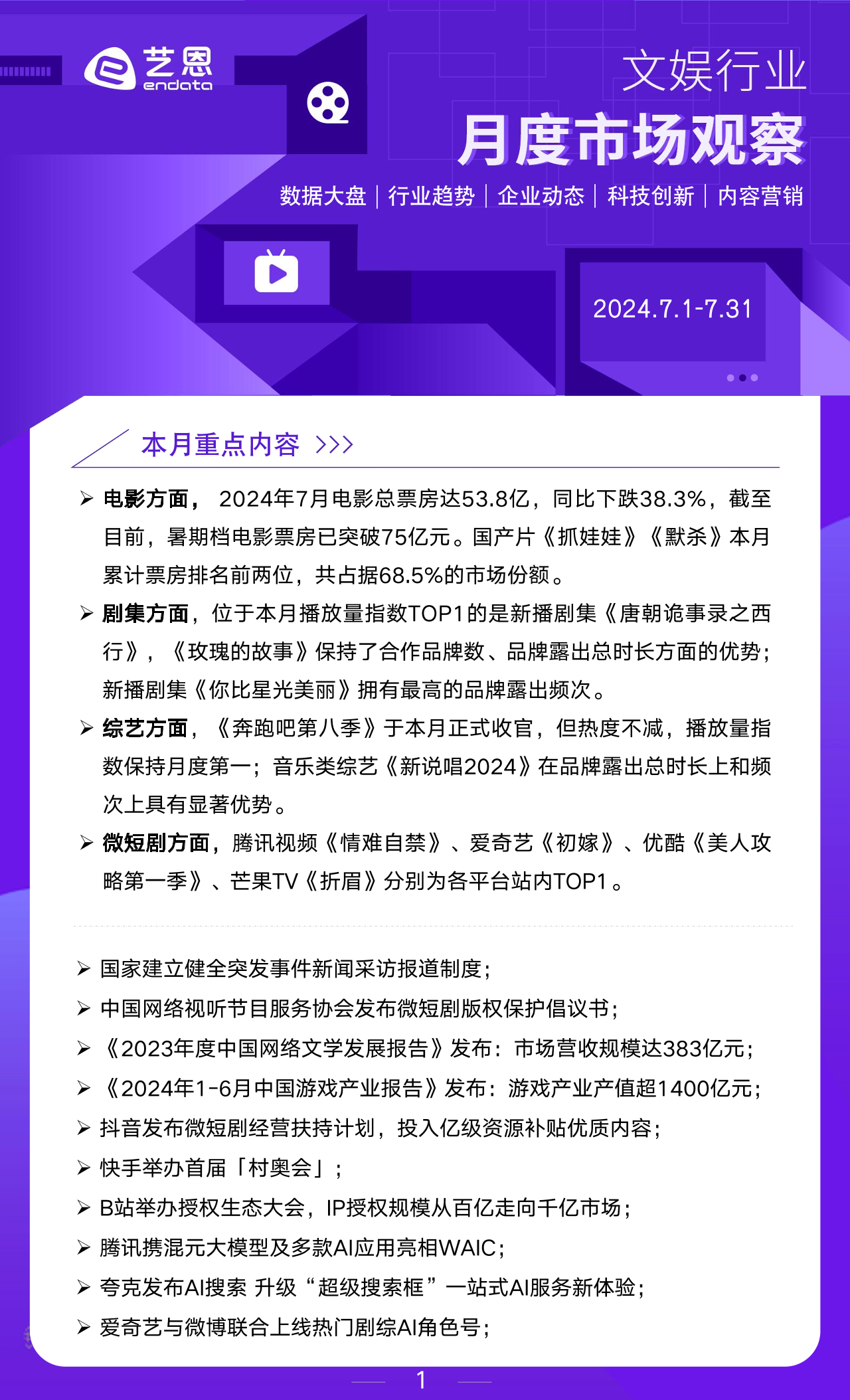 【艺恩】【20240805】2024年7月文娱行业月度市场观察报告-17页