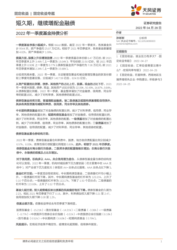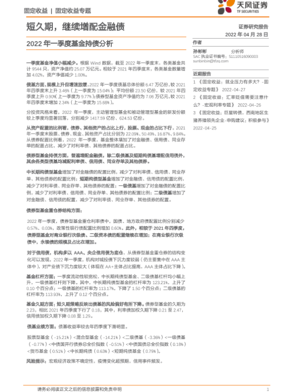 【天风证券】【20220428】2022年一季度基金持债分析:短久期,继续增配金融债-15页
