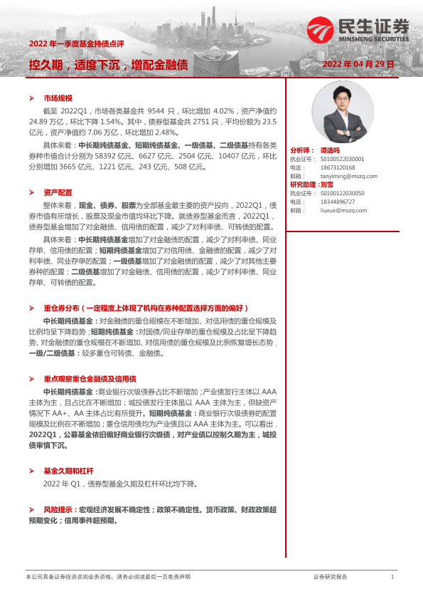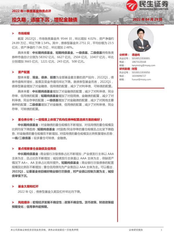 【民生证券】【20220429】2022年一季度基金持债点评:控久期,适度下沉,增配金融债-18页