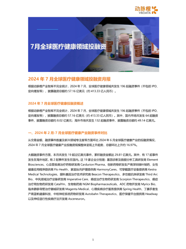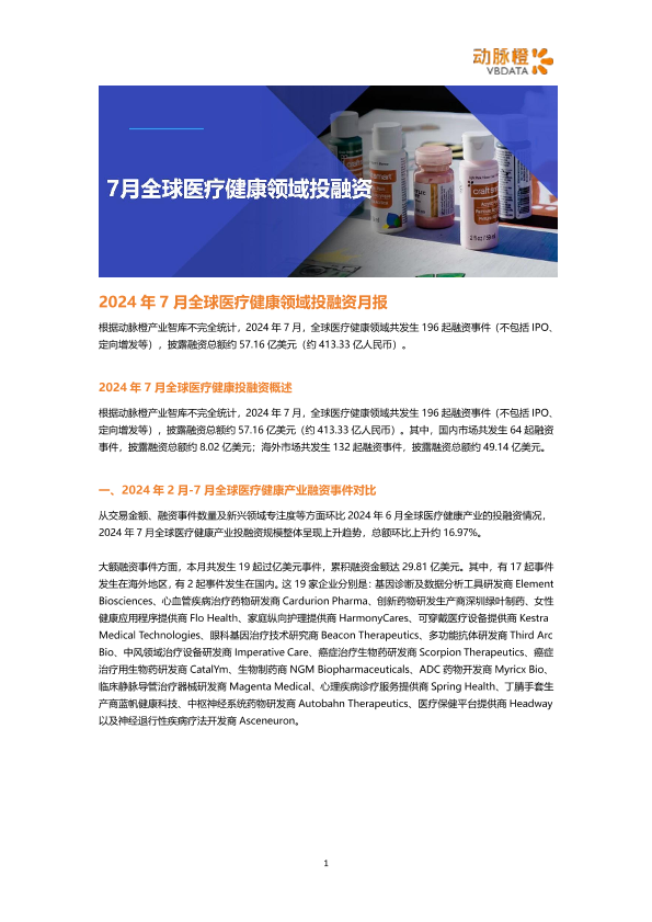 【动脉橙】【20240811】2024年7月全球医疗健康领域投融资月报-18页