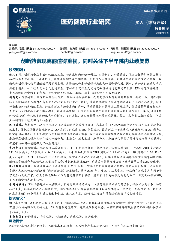 【国金证券】【20240812】2024-08-12-医药健康行业研究-创新药表现亮丽值得重视-同时关注下半年院内业绩复苏-17页