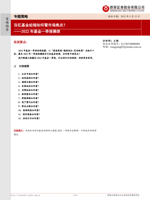 【浙商证券】【20220423】2022年基金一季报摘录:百亿基金经理如何看市场焦点?-24页
