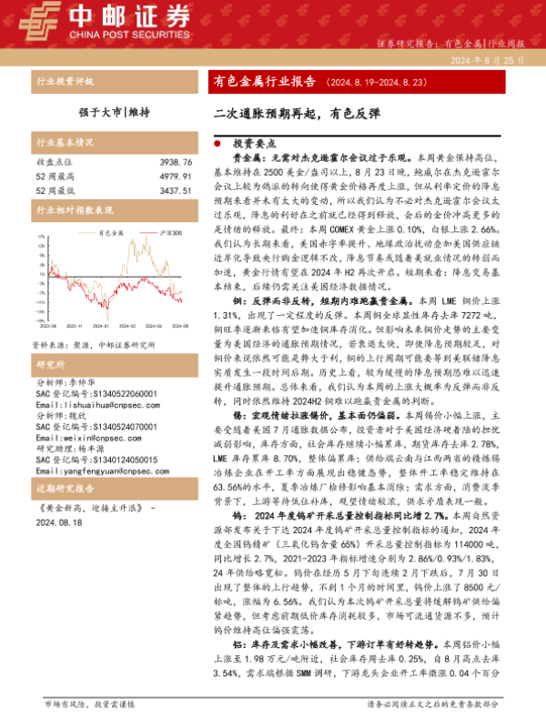 【中邮证券】【20240826】2024-08-26-有色金属行业报告-二次通胀预期再起-有色反弹-12页