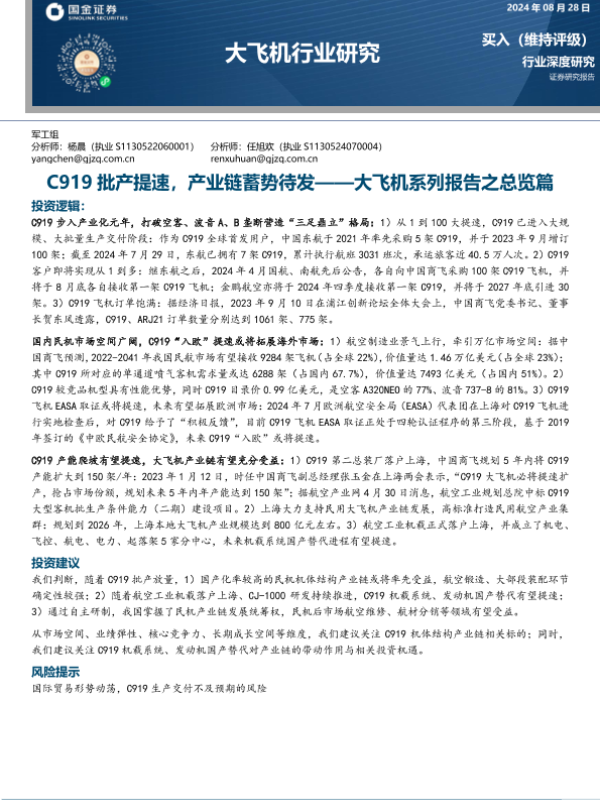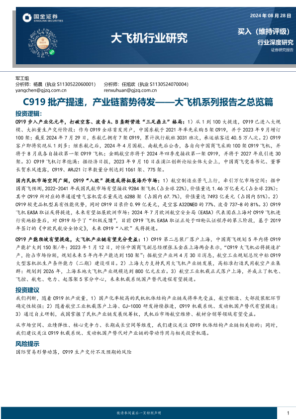 【国金证券】【20240828】C919批产提速,产业链蓄势待发——大飞机系列报告之总览篇-32页