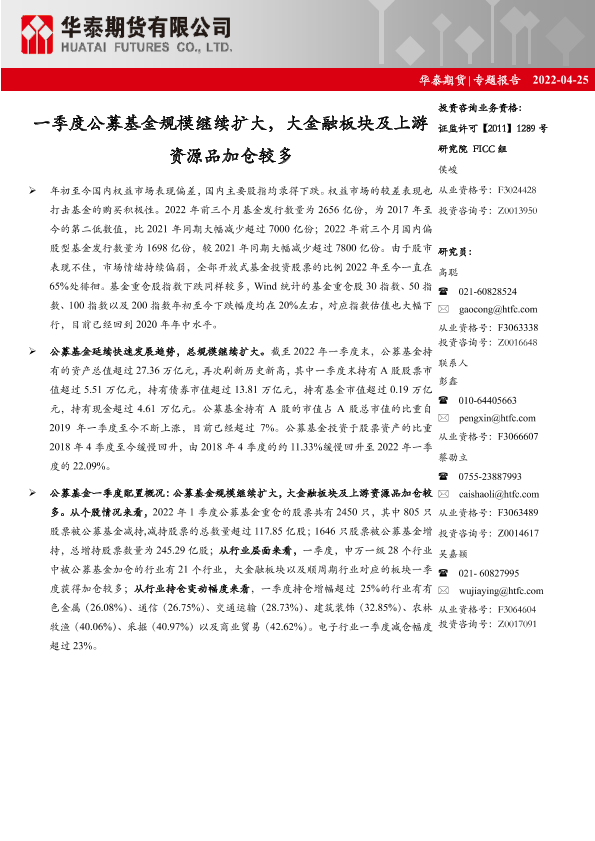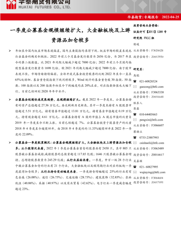 【华泰期货】【20220425】一季度公募基金规模继续扩大,大金融板块及上游资源品加仓较多-15页