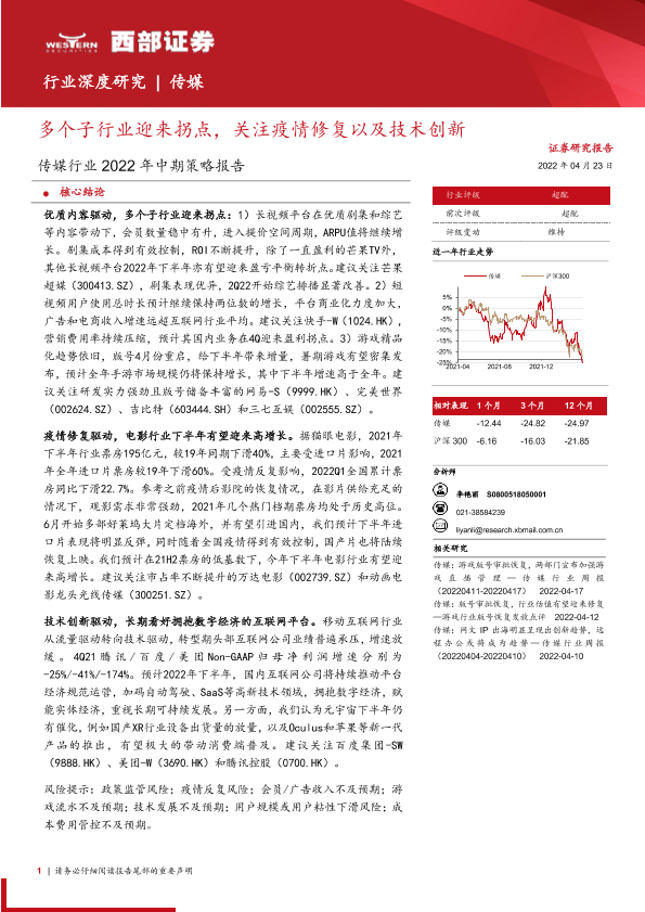 【西部证券】【20220423】传媒行业2022年中期策略报告:多个子行业迎来拐点,关注疫情修复以及技术创新-37页