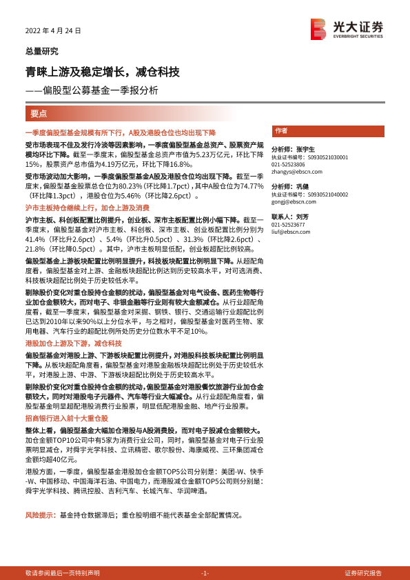 【光大证券】【20220424】偏股型公募基金一季报分析:青睐上游及稳定增长,减仓科技-16页