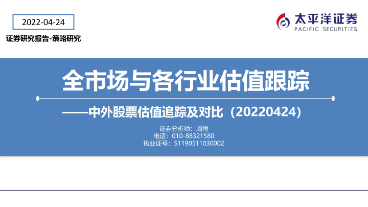 【太平洋证券】【20220424】全市场与各行业估值跟踪:中外股票估值追踪及对比-27页