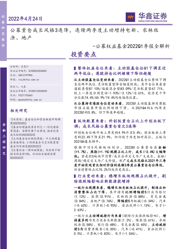 【华鑫证券】【20220424】公募权益基金2022Q1季报全解析:公募重仓成长风格3连降,连续两季度主动增持电新、农林牧渔、地产-15页