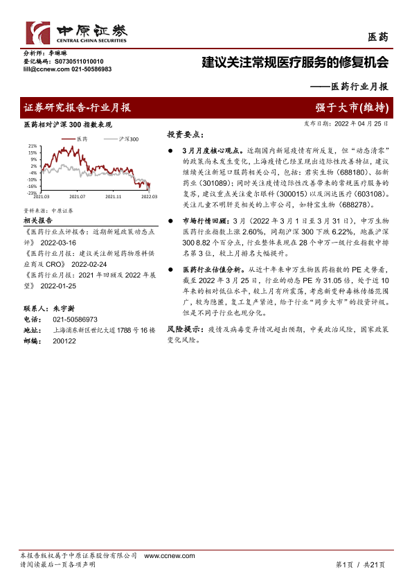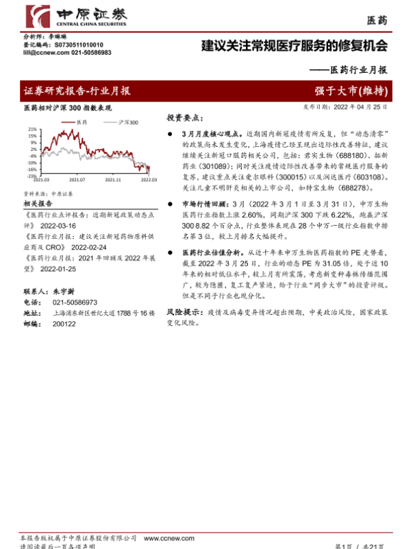 【中原证券】【20220425】医药行业月报:建议关注常规医疗服务的修复机会-21页