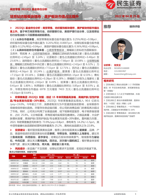 【民生证券】【20220425】商贸零售行业2022Q1基金持仓分析:培育钻纺服板块增持,美护板块市值占比提升-24页