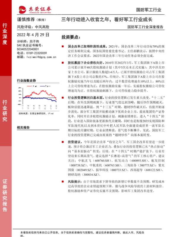 【东莞证券】【20220429】国防军工行业深度报告:三年行动进入收官之年,看好军工行业成长-16页