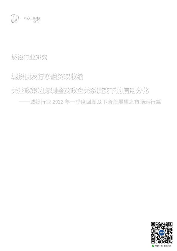 【中诚信国际】【20220425】业2022年一季度回顾及下阶段展望之市场运行篇:城投债发行净融资双收缩,关注政策边际调整及政企关系演变下的信用分化-16页