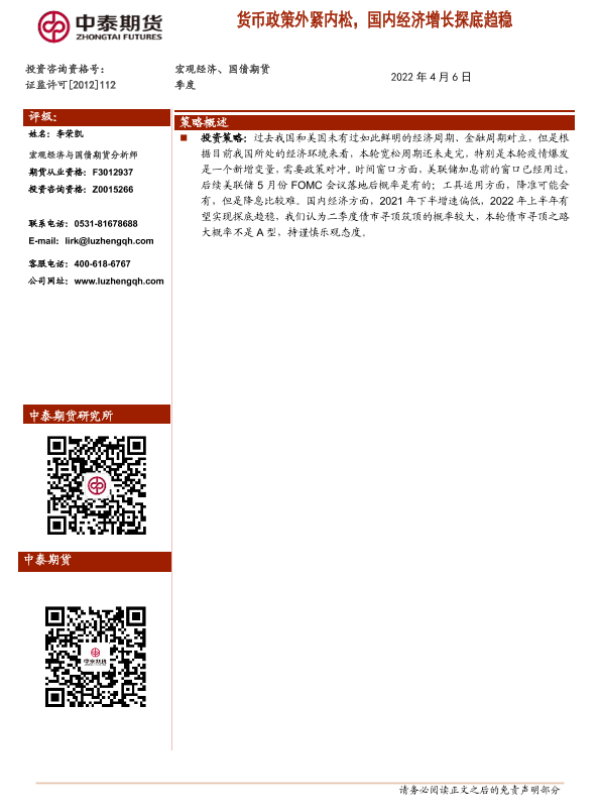 【中泰期货】【20220406】货币政策外紧内松,国内经济增长探底趋稳-17页