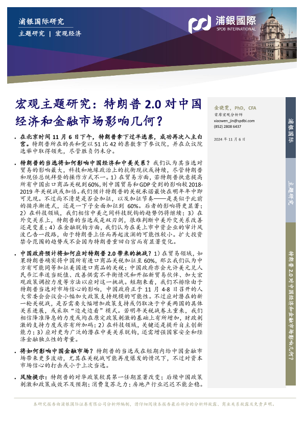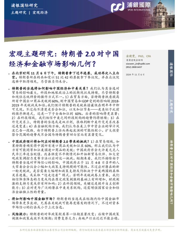 【浦银国际】【20241106】宏观主题研究:特朗普 2.0对中国 经济和金融市场影响几何?-16页