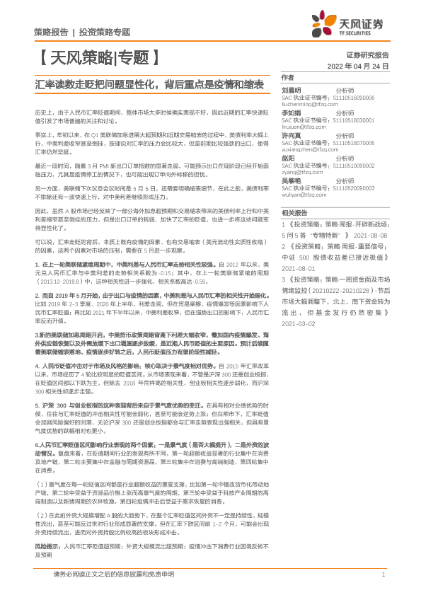 【天风证券】【20220424】投资策略专题:汇率读数走贬把问题显性化,背后重点是疫情和缩表-15页