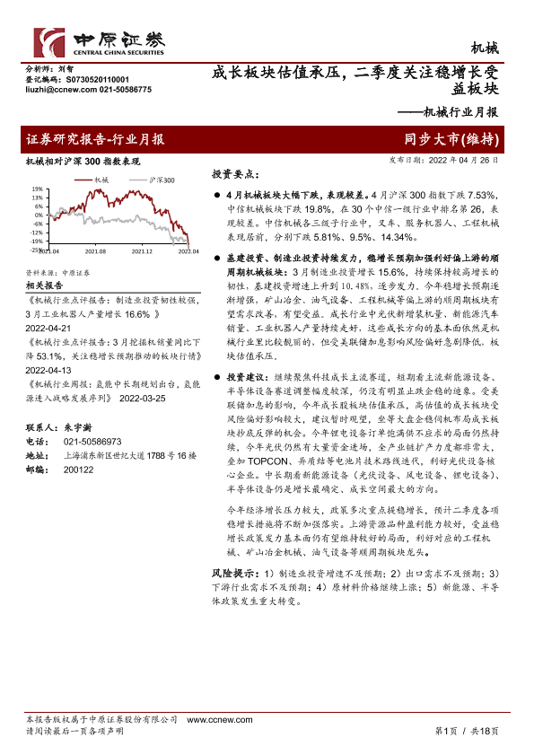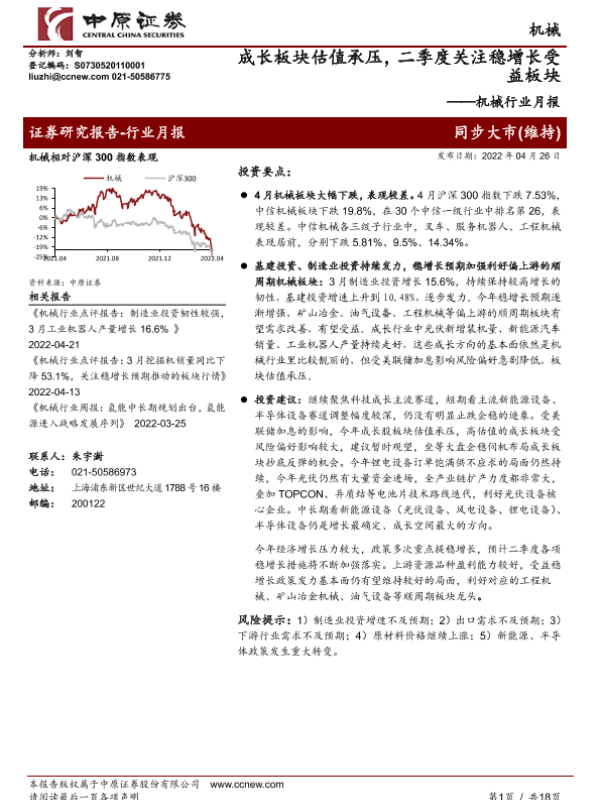 【中原证券】【20220426】机械行业月报:成长板块估值承压,二季度关注稳增长受益板块-18页