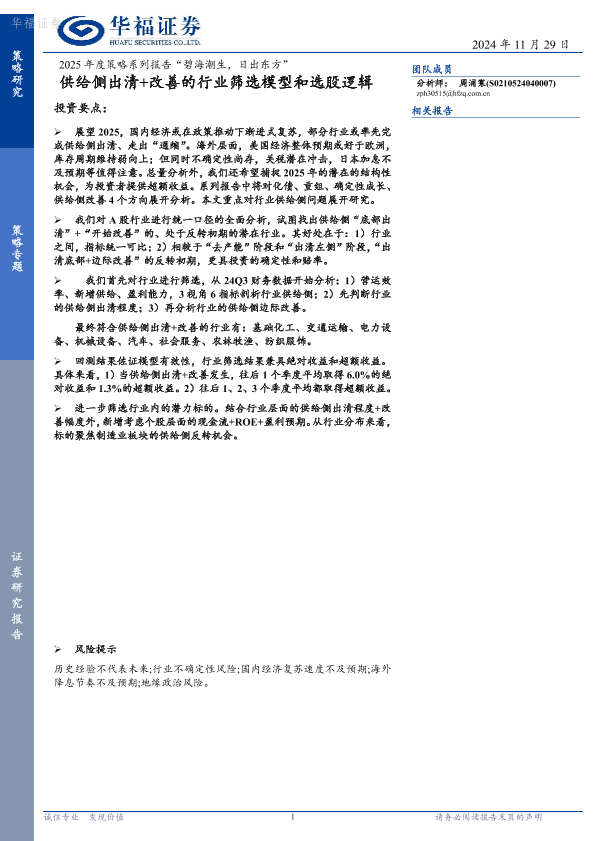 【华福证券】【20241130】2025年度策略系列报告“碧海潮生,日出东方”:供给侧出清+改善的行业筛选模型和选股逻辑-11页