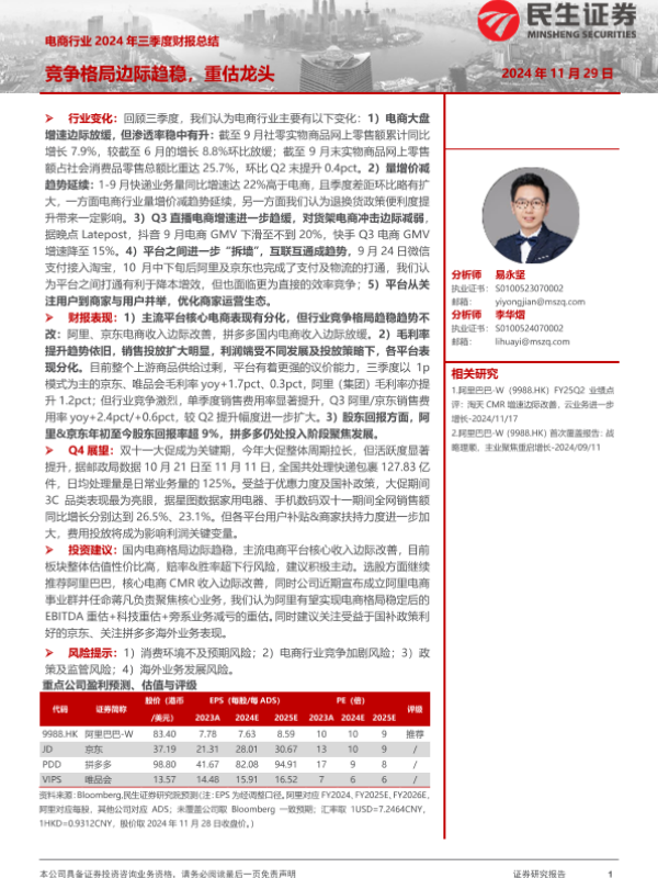【民生证券】【20241201】电商行业2024年三季度财报总结:竞争格局边际趋稳,重估龙头-16页