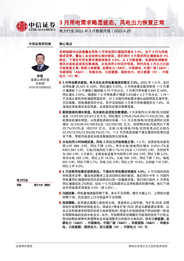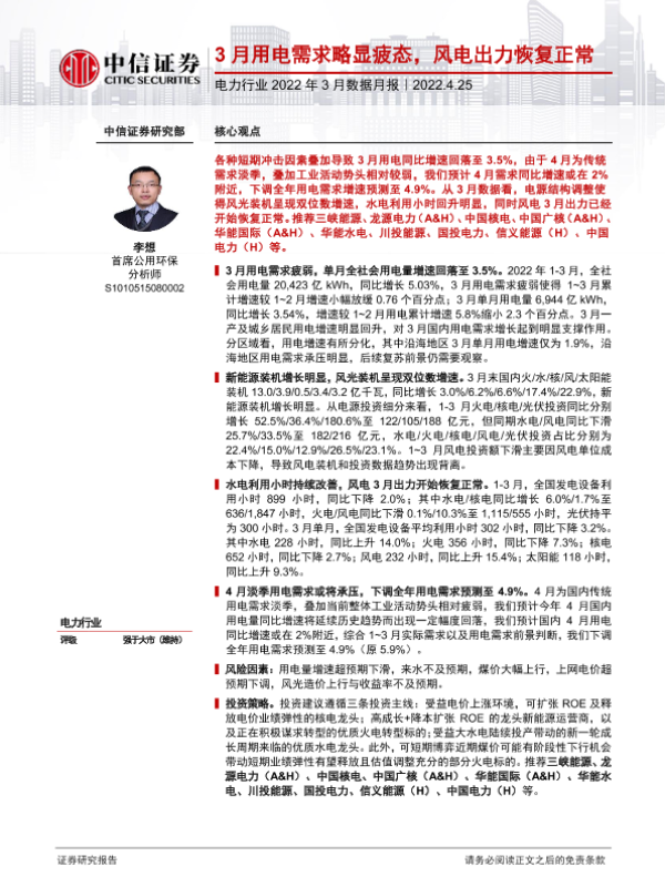 【中信证券】【20220425】电力行业2022年3月数据月报:3月用电需求略显疲态,风电出力恢复正常-16页