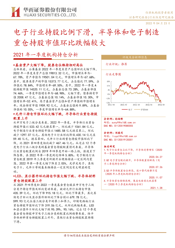 【华西证券】【20220423】电子行业2021年一季度机构持仓分析:电子行业持股比例下滑,半导体和电子制造重仓持股市值环比跌幅较大-43页
