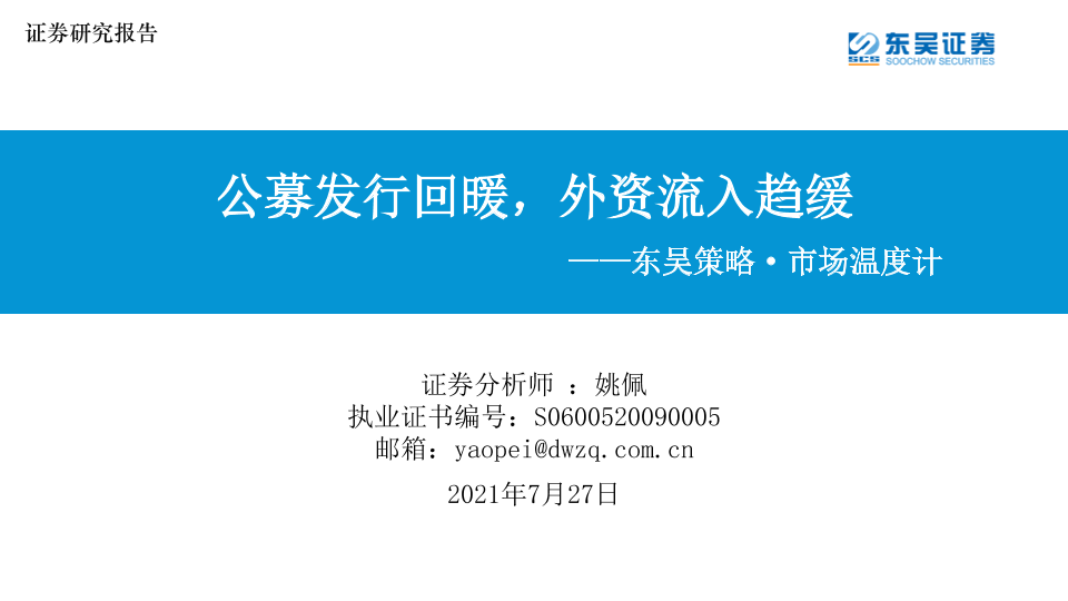 【东吴证券】【20210727】东吴策略·市场温度计:公募发行回暖,外资流入趋缓-26页