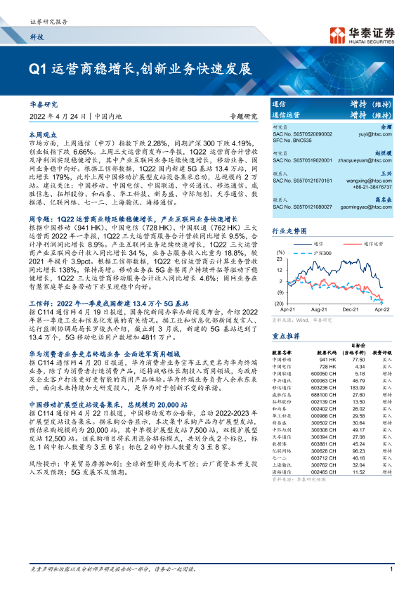 【华泰证券】【20220424】科技行业专题研究:Q1运营商稳增长,创新业务快速发展-26页