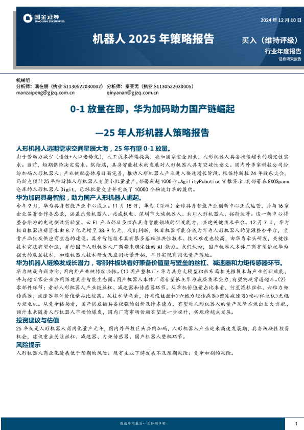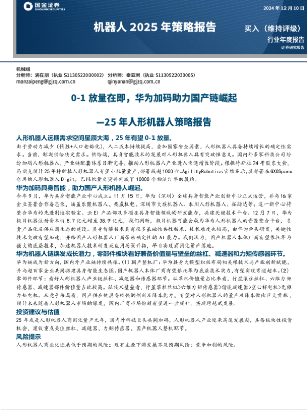 【国金证券】【202412】2024-12-15-25年人形机器人策略报告0-1放量在即华为加码助力国产链崛起-20页