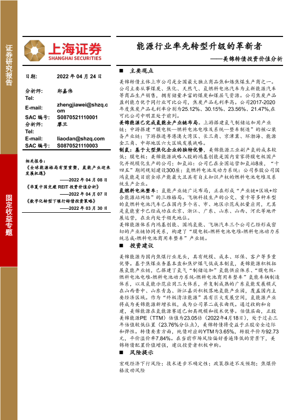【上海证券】【20220424】美锦转债投资价值分析:能源行业率先转型升级的革新者-26页