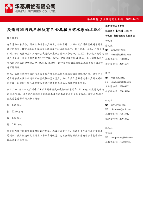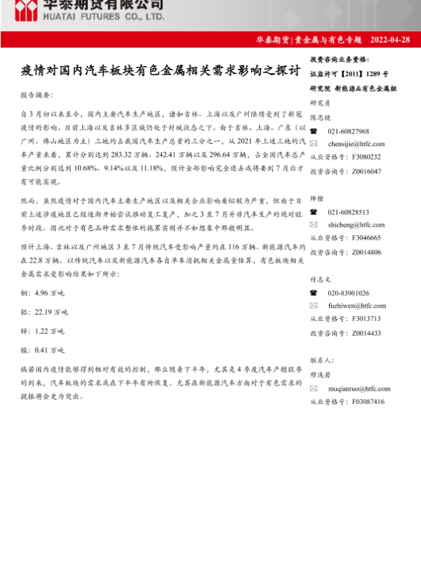【华泰期货】【20220428】疫情对国内汽车板块有色金属相关需求影响之探讨-16页