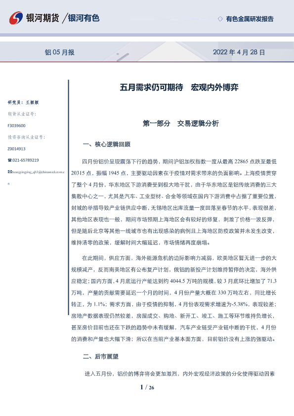 【银河期货】【20220428】铝05月报:五月需求仍可期待,宏观内外博弈-26页