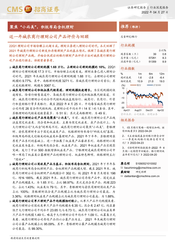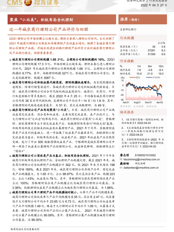 【海通证券】【20220427】银行业近一年城农商行理财公司产品评价与回顾:聚焦“小而美”,积极布局含权理财-20页
