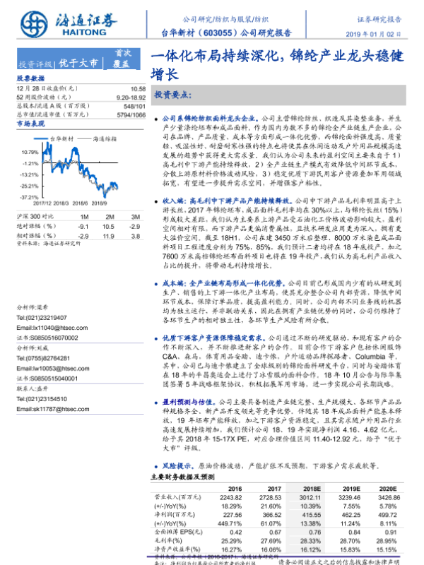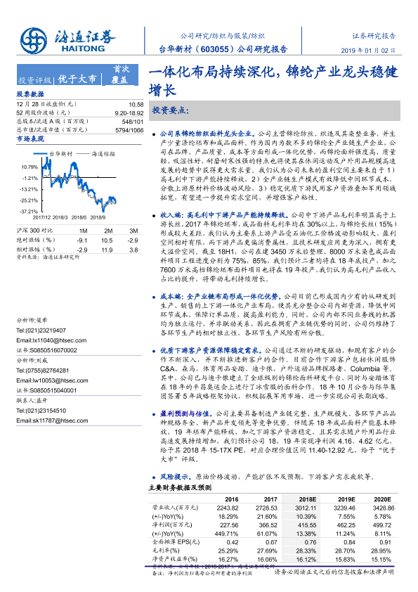【海通证券】【20190102】台华新材-603055.SH-公司研究报告:一体化布局持续深化,锦纶产业龙头稳健增长-22页