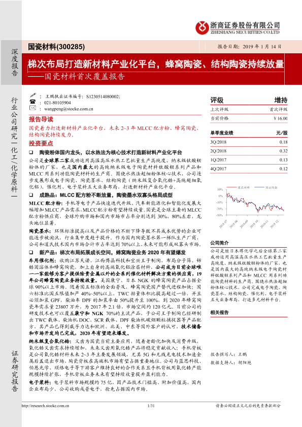 【浙商证券】【20190114】国瓷材料-300285.SZ-首次覆盖报告:梯次布局打造新材料产业化平台,蜂窝陶瓷、结构陶瓷持续放量-31页