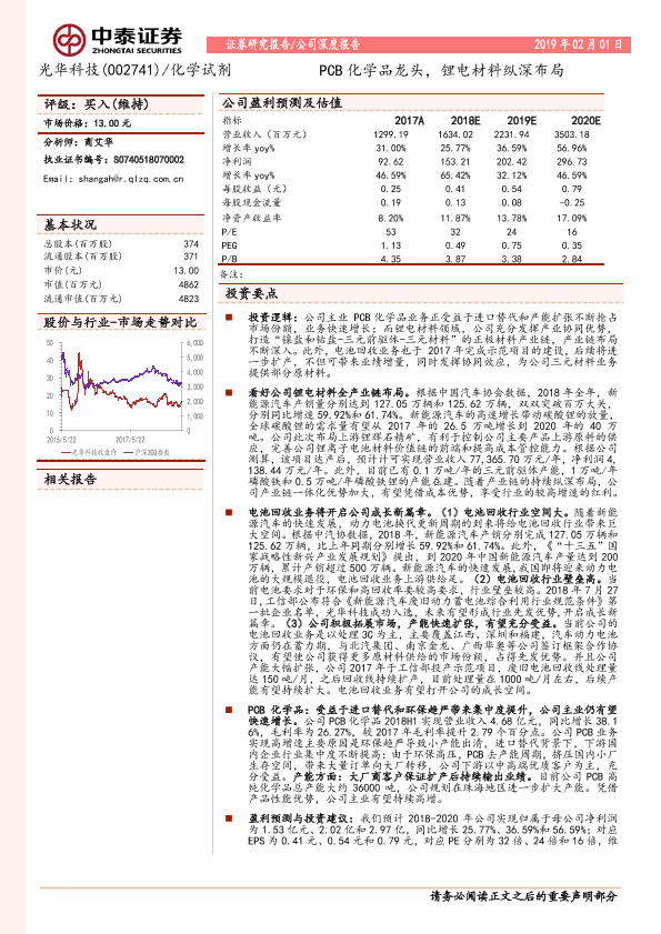 【中泰证券】【20190201】光华科技-PCB化学品龙头,锂电材料纵深布局-27页