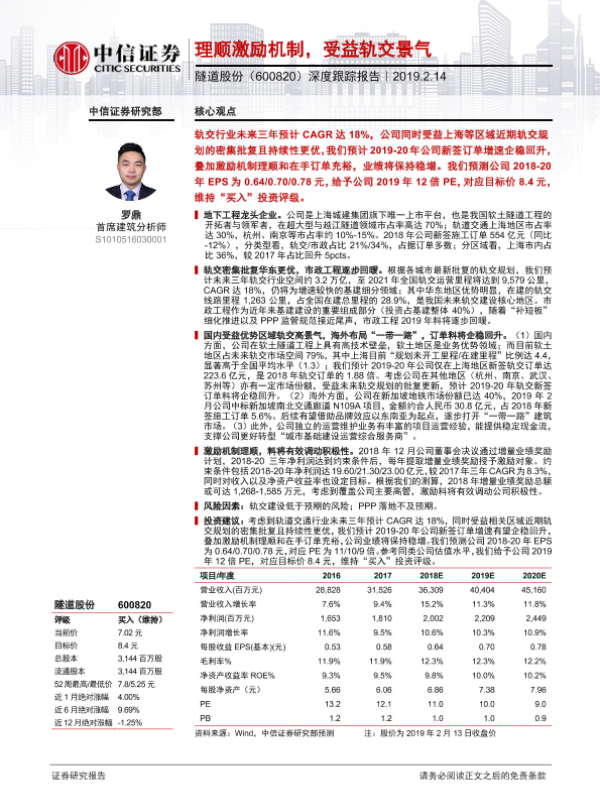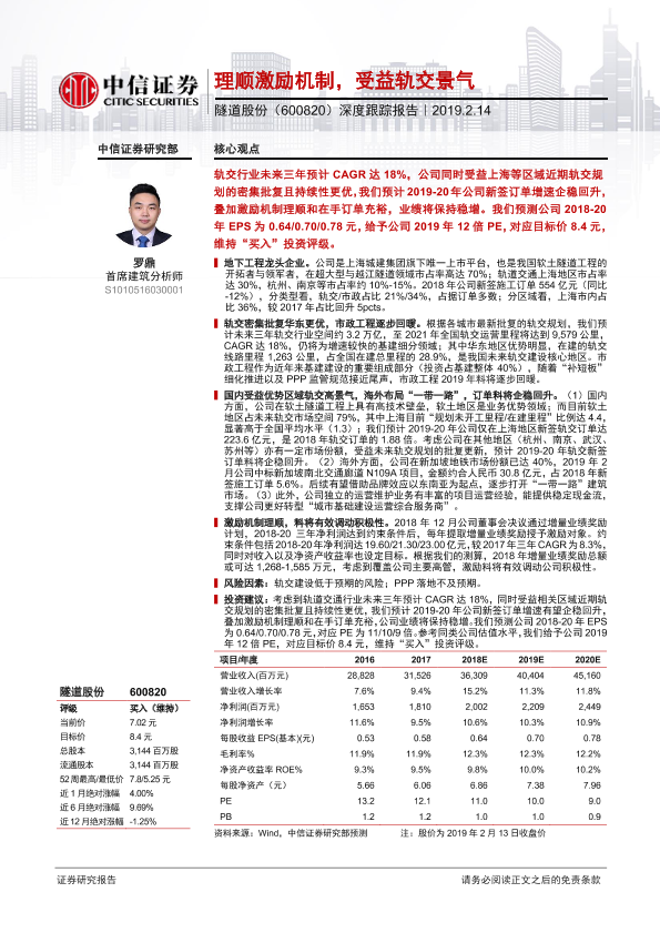 【中信证券】【20190214】20190214-中信证券-隧道股份-600820.SH-深度跟踪报告:理顺激励机制,受益轨交景气-26页