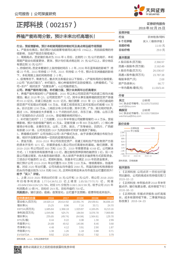 【天风证券】【20190225】正邦科技-002157.SZ-养殖产能布局分散,预计未来出栏高增长!-19页