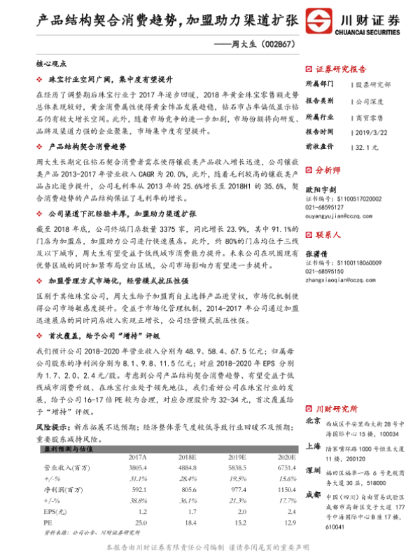 加盟模式 周大生 消费升级 渠道扩张 珠宝行业